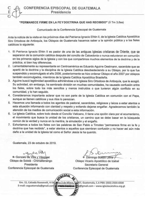 “Lamentablemente, el representante de la iglesia católica apostólica Siro Ortodoxa de Antioquía, en Centroamérica, es Eduardo Aguirre Oestmann, sacerdote que se apartó de la doctrina y de la disciplina de la iglesia católica después de desobedecer a su obispo, por lo que fue suspendido y excomulgado en 2006. Posteriormente se hizo ordenar obispo en 2007 por los obispos también excomulgados, miembros de la iglesia católica apostólica brasileña”, destaca el comunicado.