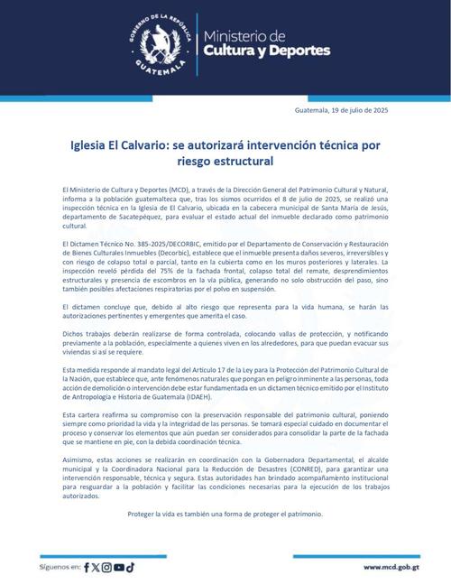 Debido a esto, el Ministerio de Cultura y Deportes, a través de la Dirección General del Patrimonio Cultural y Natural informó que se realizó una inspección técnica del templo declarado como Patrimonio Cultural.