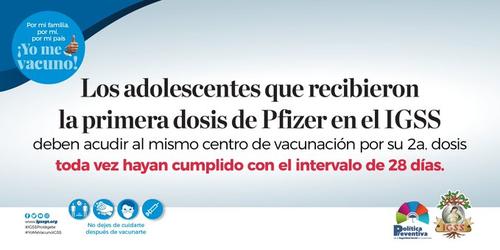 La institución informa que los jóvenes entre 12 y 17 años que reciban su segunda dosis deben asistir al mismo centro del IGSS al que acudieron para recibir su primera dosis. Además, el requisito es que la dosis haya sido administrada hace 28 días.