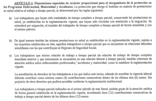 Así mismo, en el artículo 6 se incluye protección en los programas de enfermedad, maternidad y accidentes. Para tener acceso a esta ayuda se deberán cumplir un mínimo de cuatro contribuciones consecutivas y para gozar de atención médica en general se necesitan 12 meses mínimo de contribuciones.