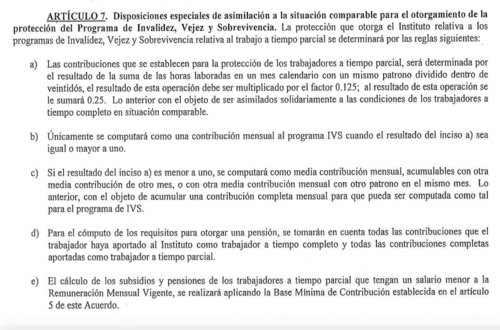 La normativa estipula los mismos derechos que un trabajador de tiempo completo pero adaptado proporcionalmente al tiempo parcial. Por ello, se estableció que la tasa de contribución del Estado para el programa de Invalidez, Vejez y Sobrevivencia (IVS) es del 1.83% sobre la base mínima de la contribución de cada afiliado.
