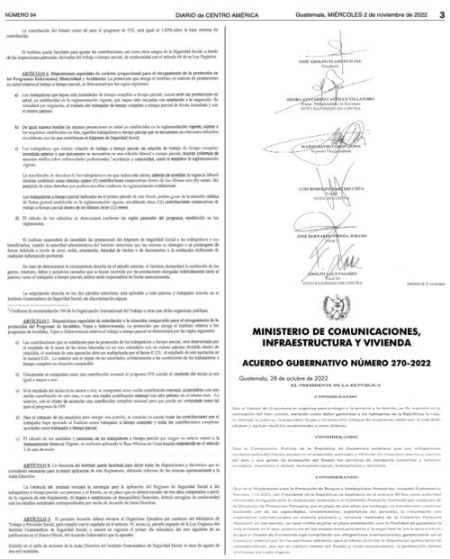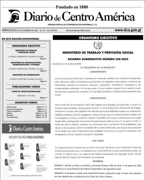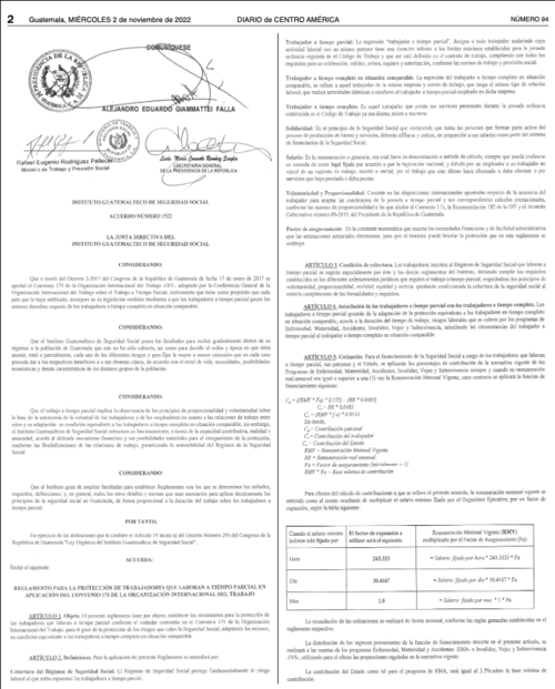 El Ministerio de Trabajo y Previsión Social ha publicado este miércoles 2 de noviembre 2022 en el diario de Centro América el Acuerdo Gubernativo 258-2022 que autoriza el reglamento del Instituto Guatemalteco de Seguridad Social (IGSS) para las prestaciones a los trabajadores de tiempo parcial. Con esto se formaliza que este grupo laboral cuente con todos los beneficios de un afiliado al Seguro Social.
