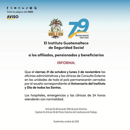 El Instituto Guatemalteco de Seguridad Social (IGSS) anunció a través de un comunicado que las clínicas de consulta externa permanecerán cerradas en todo el país este viernes 31 de octubre y lunes 3 de noviembre.