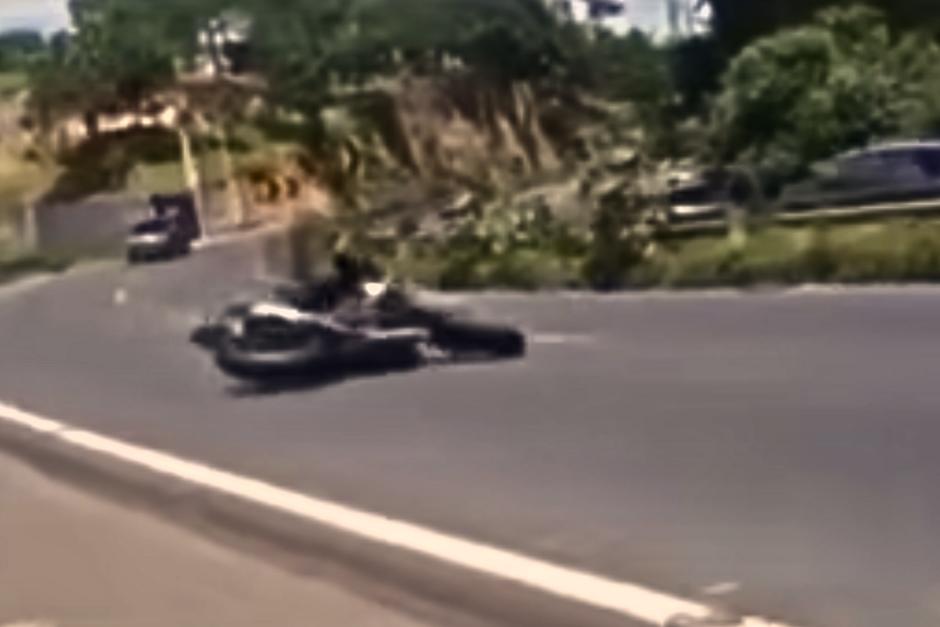 El percance vial quedó grabado en un video y muestra que en una curva, el motorista pierde el control, derrapa y junto a su motocicleta impacta con un poste.