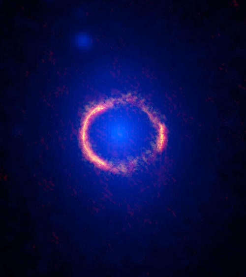 Desde el telescopio de ALMA (El Atacama Large Millimeter/submillimeter Array), se ha logrado capturar una imagen que permite ver el anillo de Einstein, con la mejor resolución hasta el momento. Este fenómeno se logra cuando se alinean dos galaxias que se ubican a 4 mil y 12 mil millones de años luz de distancia de la Tierra.