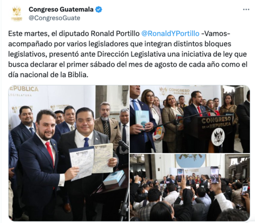 Al dar a conocer el proyecto, Allan Rodríguez y Ronald Portillo, miembros de la mencionada bancada, destacaron "la importancia de promover la lectura de la Biblia para fortalecer los valores y la espiritualidad en el país".
