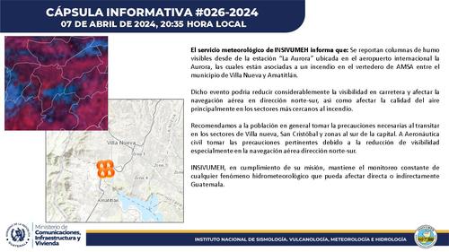 El Insivumeh emitió un informe el cual señala que el humo denso afecta la visibilidad de conductores en varias áreas, principalmente la Ruta al Pacífico. También recomiendan precaución a Aeronáutica Civil por las columnas de humo.