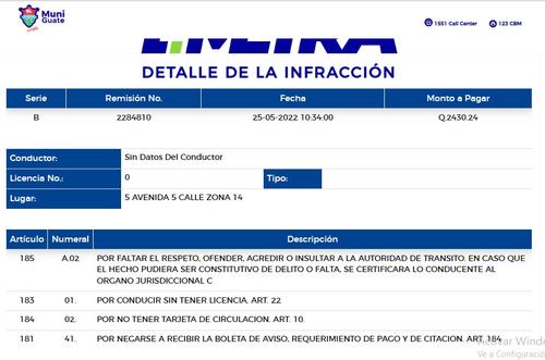 Una de ellas es por faltar el respeto, ofender, agredir o insultar a la autoridad de tránsito, según se lee en la página de la Municipalidad de Guatemala. La misma fue interpuesta en la zona 14 capitalina.