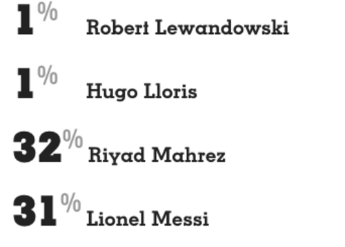 Con casi 1.2 millones de votos, el ganador para los lectores de France Football sería Riyad Mahrez, con 32%. Hay una razón detrás: el jugador del Leicester City juega para Argelia, pero nació en Francia y creció allí futbolísticamente, antes de irse a Inglaterra.