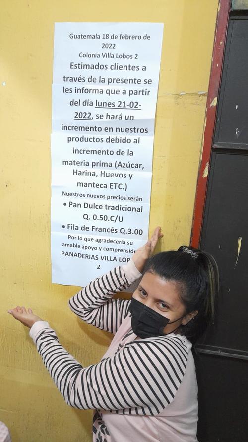 "Estimados clientes a través de la presente se les informa que a partir del día lunes 21-02-2022 se hará un incremento en nuestros productos debido al incremento de la materia prima (azúcar, harina, huevos, manteca, etc)", se lee en un anuncio en una panadería de Villa Lobos.