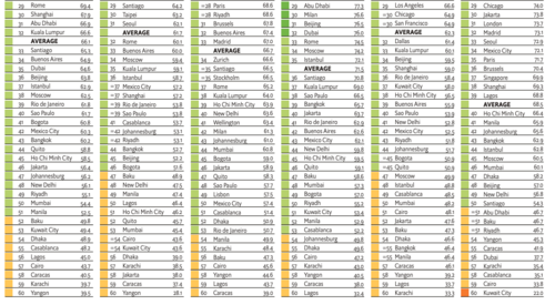 Solo 60 países entraron en la clasificación siendo el último, Yangon, con 39.5 puntos. Guatemala promedió por debajo de los 39 puntos por lo que no calificó en ninguna de las cinco categorías descritas, ni en el promedio de todas. Santiago de Chile y Buenos Aires se encuentran en el puesto 33 y 34, respectivamente, siendo las ciudades más destacadas de Latinoamérica.