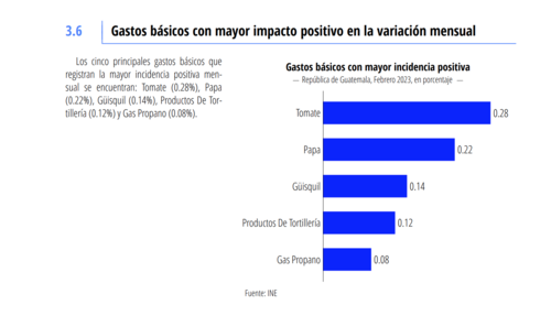 Mientras tanto, el transporte es la división de gasto con mayor incidencia negativa mensual con (-0.39). Por su parte, los cinco principales gastos básicos que registran mayor incidencia positiva mensual son: el tomate, la papa, el güisquil, productos de tortillería y gas propano.