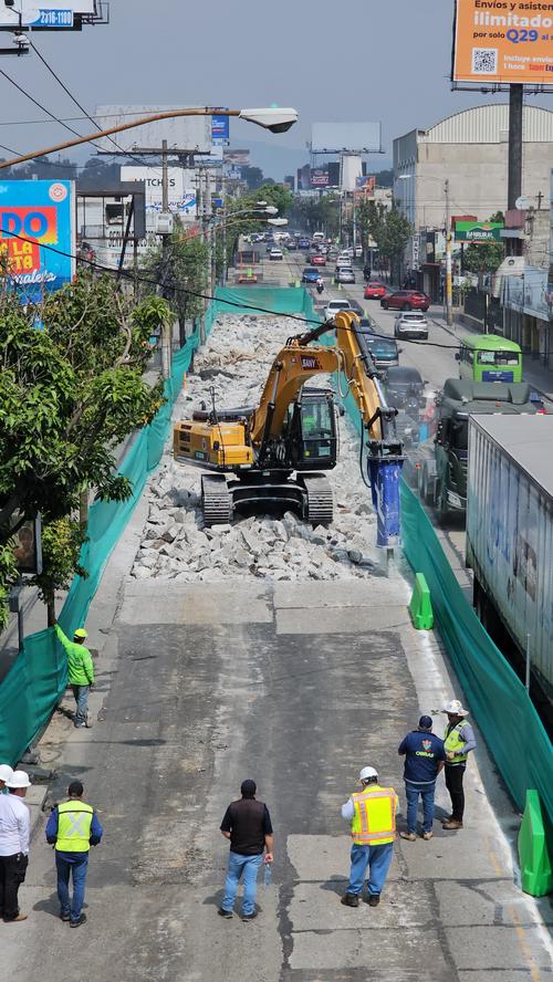 A través de una foto compartida por la Municipalidad de Guatemala se observa cómo un martillo hidráulico realiza su labor, mientras se mantiene un cierre en el área para evitar que los vehículos transiten por el lugar.