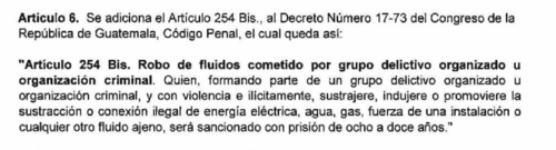 El proyecto de ley tiene contemplada la modificación al artículo 249 del Código Penal que se refiere al Hurto de fluidos y el delito quedaría calificado como "Hurto de fluidos cometido por grupo delictivo organizado u organización criminal" y se agrega una condena de 4 a 8 años de prisión con una multa de Q100 mil.