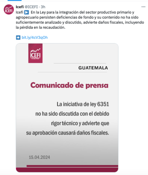 Por su parte, el Instituto Centroamericano de Estudios Fiscales (Icefi) opinó que la Comisión de Agricultura, Ganadería y Pesca del Congreso se apresuró al dictaminar esta propuesta, que, de acuerdo con su análisis, carece de elementos "básicos y esenciales para una modificación de la legislación tributaria".