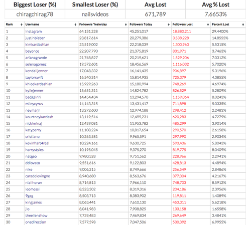 Todas las cuentas inactivas, falsas y las que causan "spam" se han eliminado de Instagram, lo que ha provocado que los usuarios protesten. Varios famosos han perdido miles de seguidores en sus redes, según dio a conocer en su blog el desarrollador Zach Allia, quien asegura que por ejemplo Justin Bieber perdió 3.5 millones de seguidores y Kim Kardashian se quedó sin 1.3 millones de "followers".