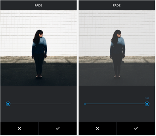 Con la opción Fade, podrás reducir el contraste y los negros se convertirán en grisáceos, tratando de imitar que se visualice como un film antiguo, algo que se ve mucho en los filtros de VSCO. Esta herramienta funciona como las demás con un slider que te permite aumentar o disminuir el efecto.