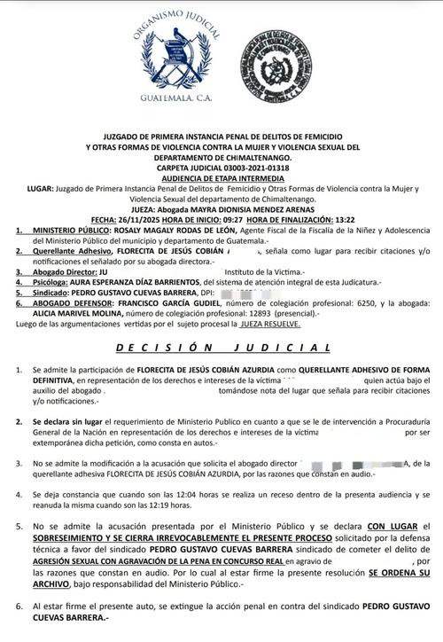 Esta Sala es la que tiene jurisdicción en Chimaltenango, en donde el caso se encuentra actualmente. Además, fue la misma Sala que en noviembre de 2024, admitió la apelación y ordenó a la jueza Méndez a ligar a proceso penal a Cuevas.