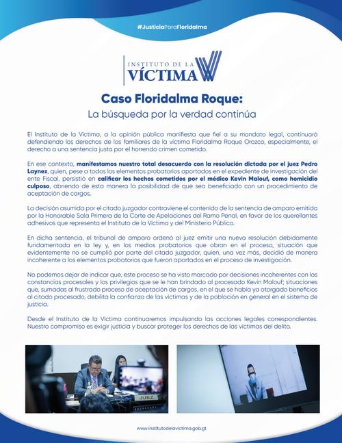 En su comunicado, el Instituto de la Víctima señala al juez de "irrespetar" la sentencia emitida por la Sala Primera de Apelaciones, que ordenó resolver nuevamente en el caso de Kevin Malouf, basándose en "en los medios probatorios que obran en el proceso".