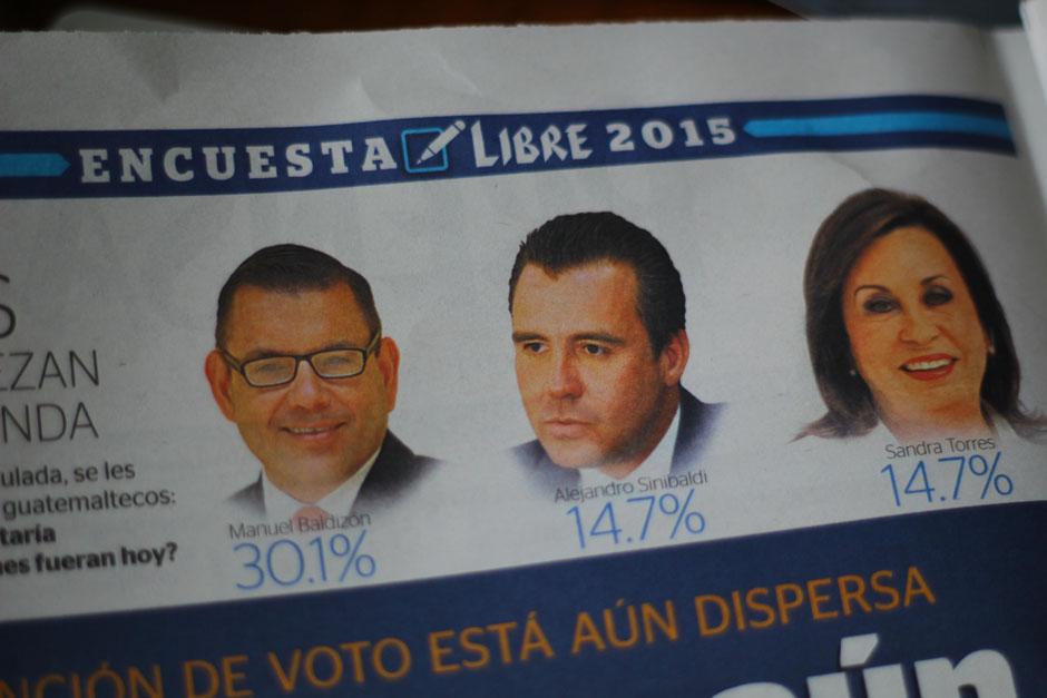 Prensa Libre publicó este lunes una nueva edición de su Encuesta Libre, la cual muestra una caída en la intención de voto del candidato de Lider, Manuel Baldizón. Además, destacó un incremento en Sandra Torres, de la UNE, y Alejandro Sinibaldi.