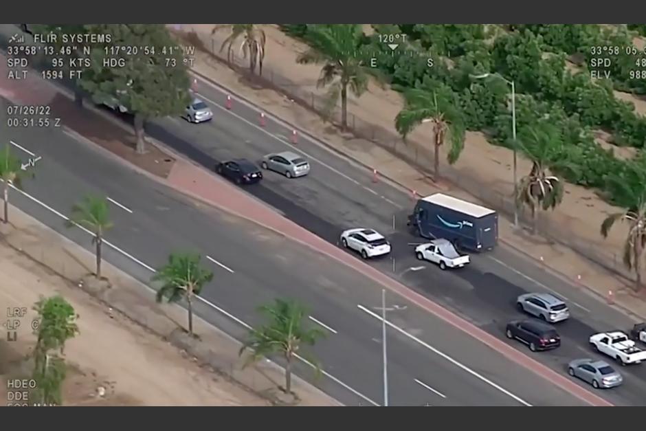 El Departamento Policial de Riverside en California, Estados Unidos, publicó un video en el que quedó grabado el momento en que un hombre es perseguido por la autopista mientras intenta huir en un camión de la empresa Amazon.