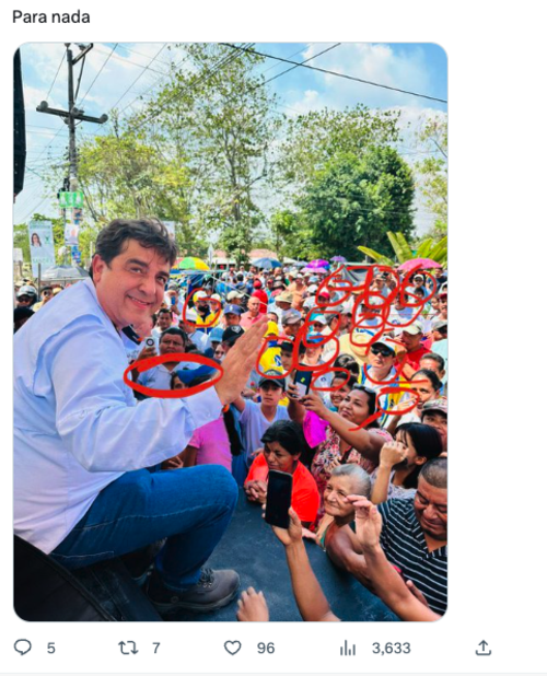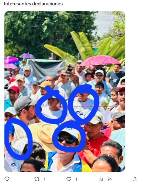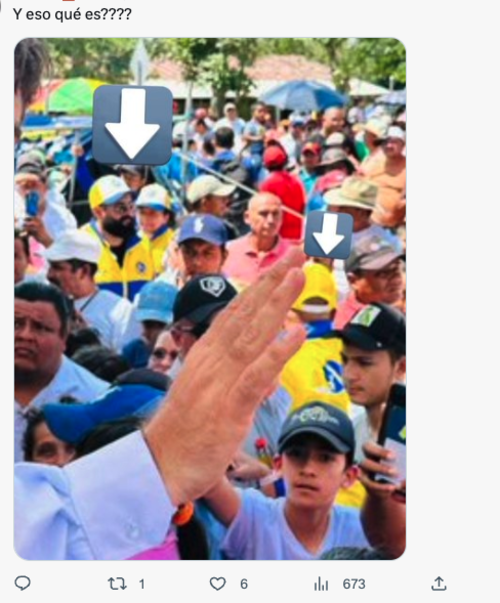 En se sentido, varias personas respondieron a su publicación con fotografías de otros mitines en donde le entregan productos a sus simpatizantes. "En su propia foto se ve JAJA aparte, en mi municipio, el día que usted vino, vi a personas con camisas de su partido", y adjunta una foto como evidencia.