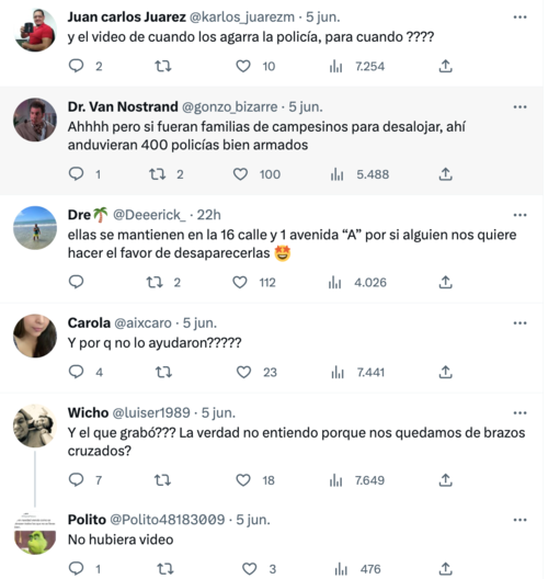 Además, hicieron un llamado a la Policía Nacional Civil (PNC) para que intervenga y criticaron al autor del video, por no haber ayudado a la víctima del asalto. Muchos otros criticaron que la policía no procesa a estas personas porque no existe una denuncia.