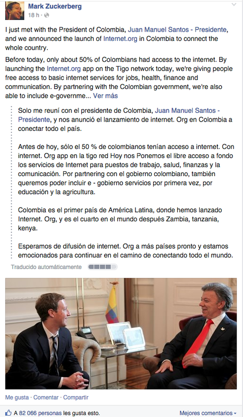 Zuckerberg viajó hoy a Bogotá, donde fue recibido por el presidente colombiano, Juan Manuel Santos, en la Casa de Nariño (sede del Ejecutivo), para formalizar el ingreso del país a esta iniciativa, de la que ya forman parte Zambia, Kenia y Tanzania, todas ellas naciones africanas.