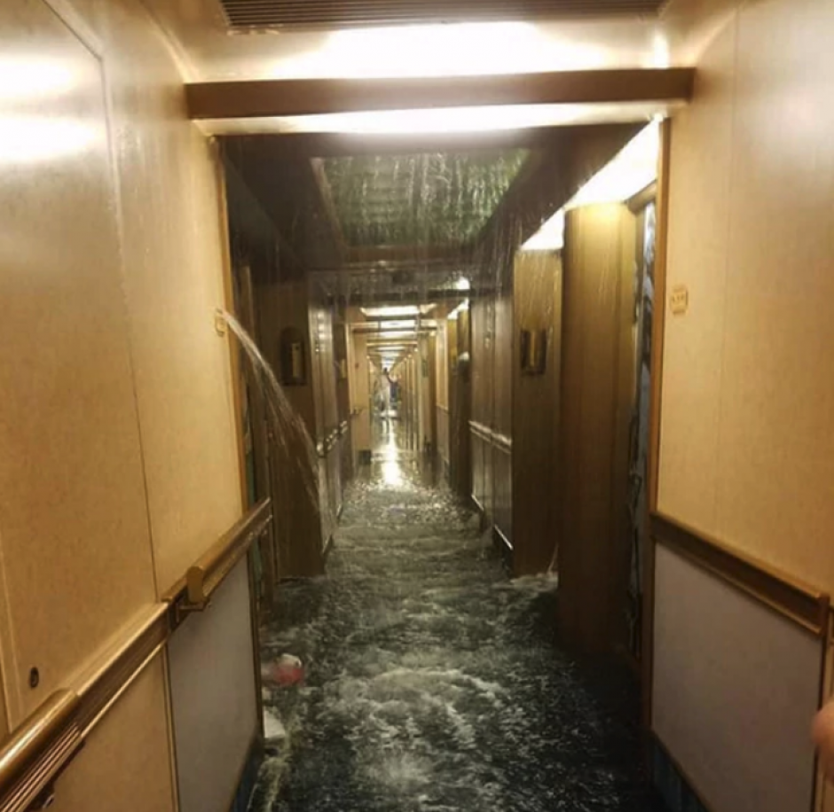 El crucero había zarpado de Nueva Orleans el domingo pasado y navegaba viento en popa en un itinerario de siete días por el Caribe occidental. De pronto, comenzó un "diluvio" en la cubierta 9. Se había quebrado el sistema de extinción de incendios, lo cual produjo el estallido de la tubería.