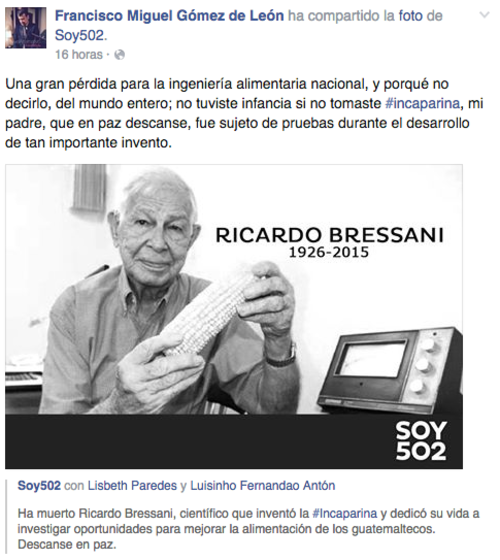 Triste noticia. Falleció don Ricardo Bressani, el creador de algo que todos hemos tomado e importante para el país: la incaparina.