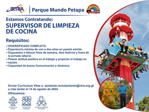 En esta ocasión, se trata de cuatro puestos para el Parque Mundo Petapa: Cocinero I, Despachador de punto de venta (femenino), Garrotero (encargado de limpieza y montaje de salón) y Supervisor de cocina.