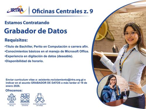 El Instituto de Recreación de los Trabajadores de la Empresa Privada de Guatemala (Irtra) anunció a través de sus redes sociales una nueva vacante para trabajar en oficinas centrales, zona 9.