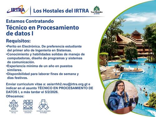 Envia tu CV a: asisrrhh2.reu@irtra.org.gt e indica en el asunto TÉCNICO EN PROCESAMIENTO DE DATOS I.