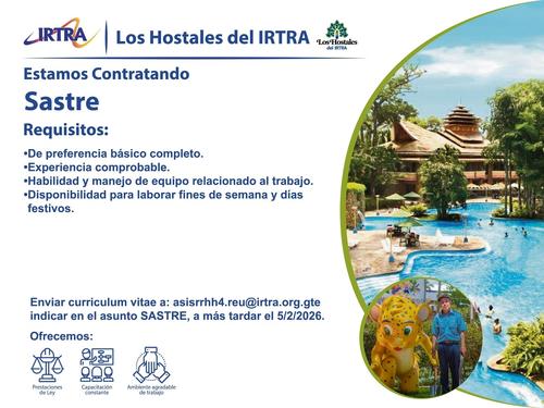 Enviar tu CV a: asisrrhh4.reu@irtra.org.gt e indica en el asunto SASTRE.