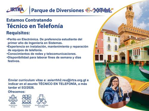 Envia tu CV a: asisrrhh2.reu@irtra.org.gt e indica en el asunto TÉCNICO EN TELEFONÍA.