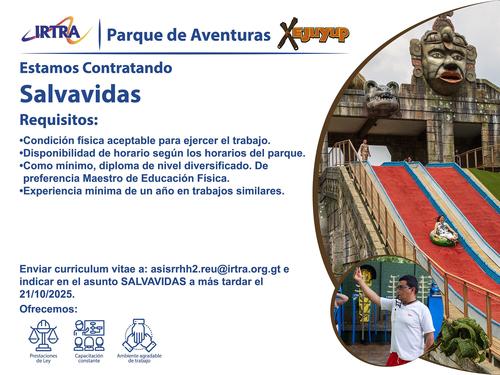 Envía tu CV a asisrrhh2.reu@irtra.org.gt e indica el puesto Salvavidas. Tienes hasta el 21 de octubre.