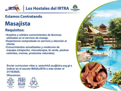 Envía tu CV a asisrrhh2.reu@irtra.org.gt e indica el puesto Masajista. Tienes hasta el 21 de octubre.