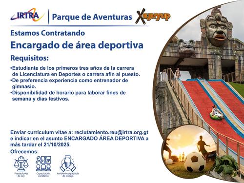 Envía tu CV a reclutamiento.reu@irtra.org.gt e indica el puesto Encargado de área deportiva. Tienes hasta el 21 de octubre.