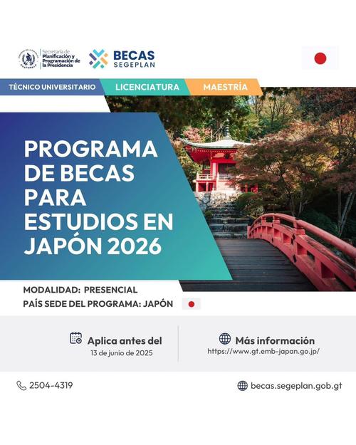 Debes aplicar antes del 13 de junio de 2025. El objetivo de este programa de becas por el Ministerio de Educación, Cultura, Deportes, Ciencia y Tecnología de Japón es desarrollar recursos humanos que puedan servir como puente entre Japón y Guatemala.
