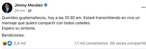 "Queridos guatemaltecos, hoy a las 10:30 am. estaré transmitiendo en vivo un mensaje que quiero compartir con todos ustedes espero su sintonía. Bendiciones", escribió Morales en sus cuentas de las redes sociales.
