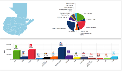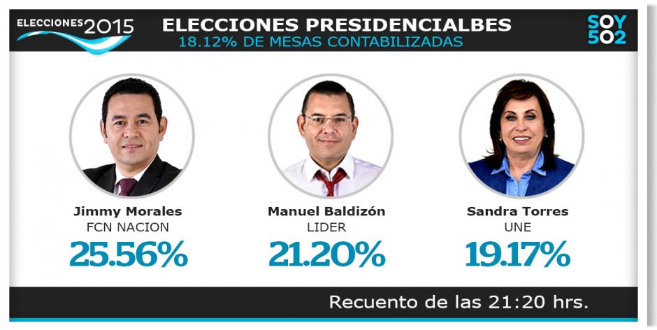 En general, Jimmy Morales lidera la votación con poco más del 25% de los votos, mientras que Manuel Baldizón suma el 21%, seguido de Sandra Torres con el 19%.