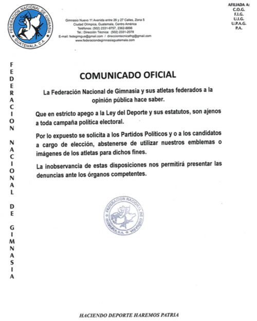 Por medio de un comunicado publicado en sus redes sociales, dicha federación, rechaza este tipo de prácticas ya que el deporte federado guatemalteco y sobre todo los atletas olímpicos tienen prohibición de participar en proselitismo.
