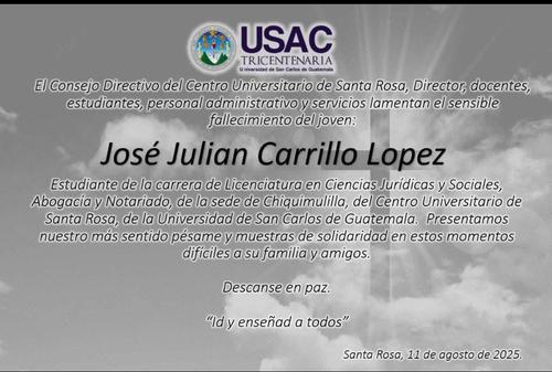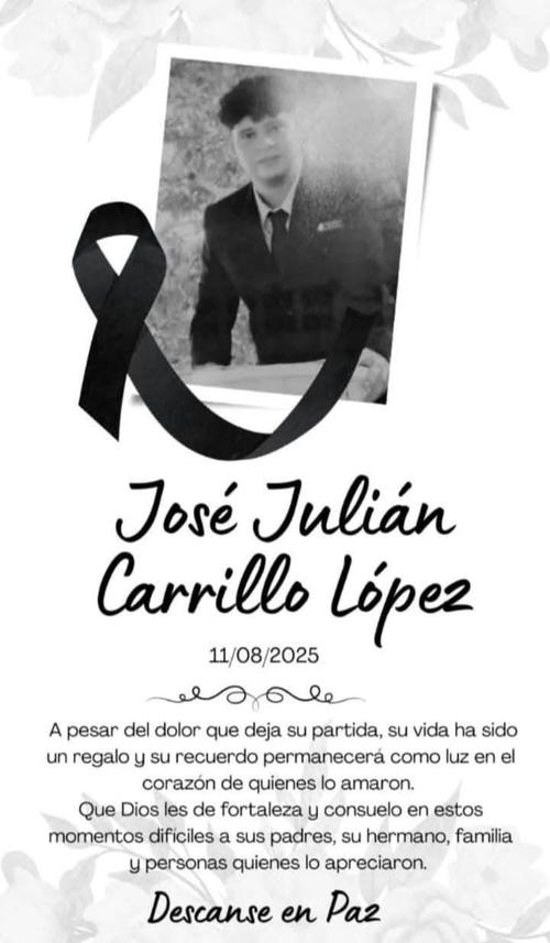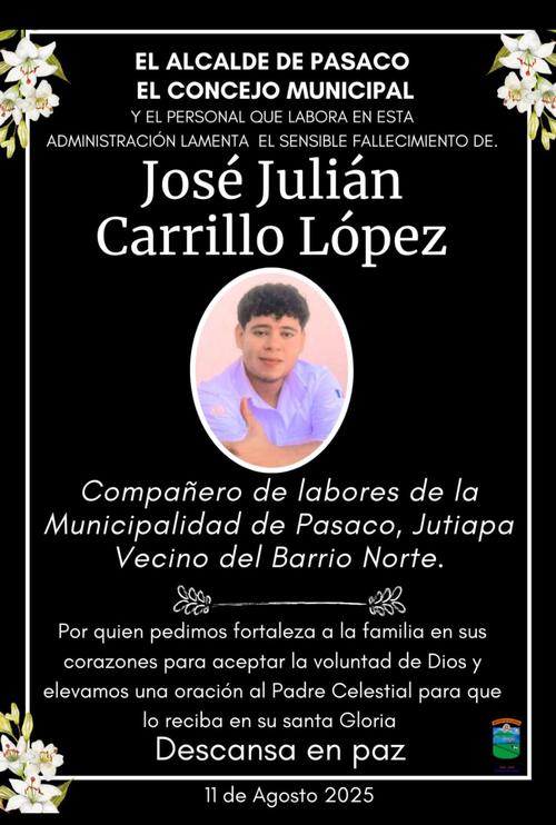 "La Directiva del Cocode Barrio Centro, Lamenta el sensible fallecimiento del joven, José Julian Carrillo López...Pedimos a Nuestro Padre Celestial, fortaleza para sus padres, hermano, tíos y demás familia", indicaron.