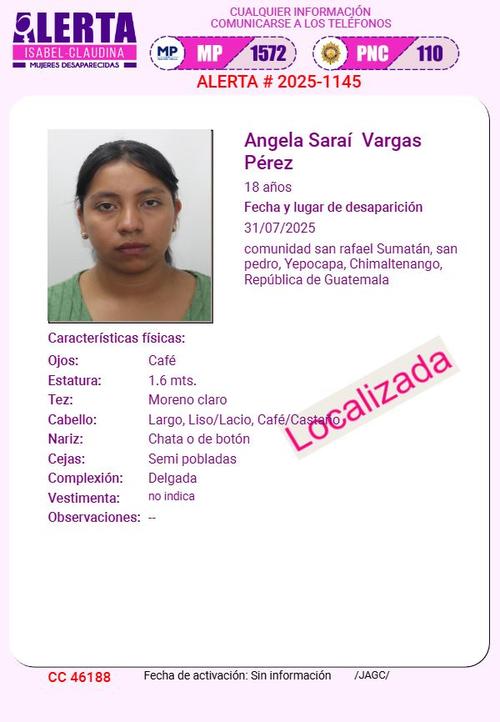 Ángela Saraí Vargas Pérez, de 18 años, fue reportada como desaparecida el pasado 28 de julio, sin embargo, la joven ya fue localizada.