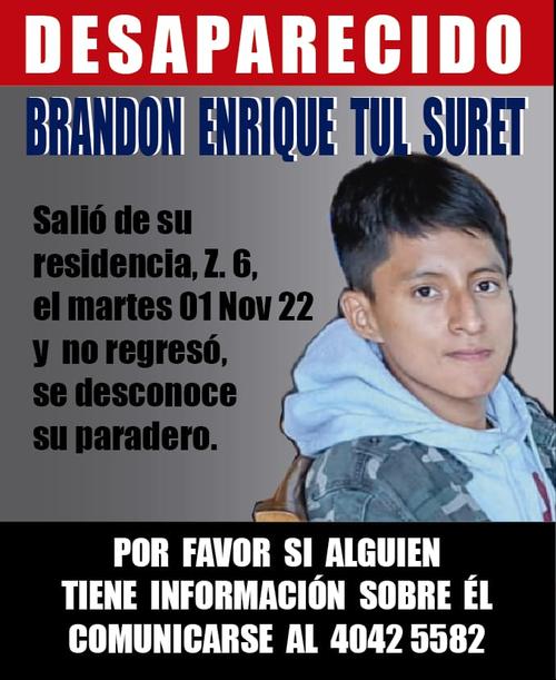 Se trata de Brandon Enrique Tul Suret, quien salió de su vivienda para realizar compras en el Día de Muertos, pero no regresó a casa. El joven estaba acompañado de un amigo, quien tampoco ha sido localizado.