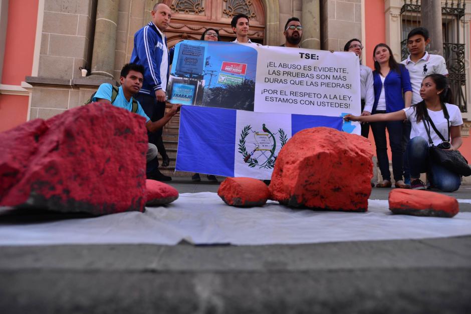En la manta que llevaron durante la protesta, se hacía alusión que las pruebas de campaña anticipada eran evidentes y que por ello llevaban las piedras hasta las puertas del máximo ente electoral para que los Magistrados pudieran verlas. La magistrada María Eugenia Mijangos, del TSE, accedió a atender sus peticiones, así como un magistrado suplente.