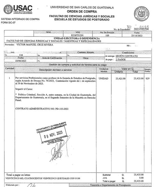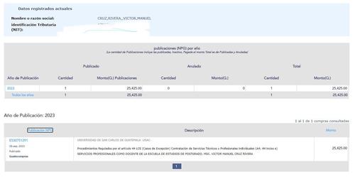 Además, el juez en mención tiene contrato vigente con la USAC por Q25,425.00 del 1 de septiembre al 30 de Noviembre de 2023, según consta en los documentos en Guatecompras.