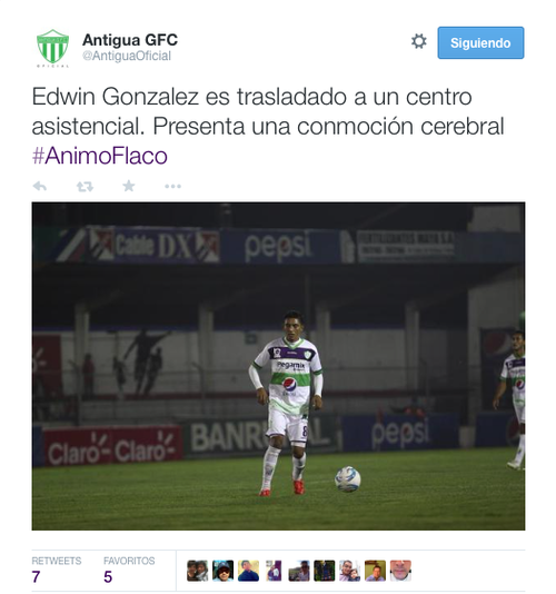 El cierre de la jornada sabatina de la Liga Nacional, deja como saldo una preocupante lesión que sufrió el volante de Antigua GFC, Edwin González, quien según reportes del médico de su equipo sufrió una conmoción cerebral durante el partido en que los "Panzaverdes" cayeron 1-0 de visita ante Xelajú.