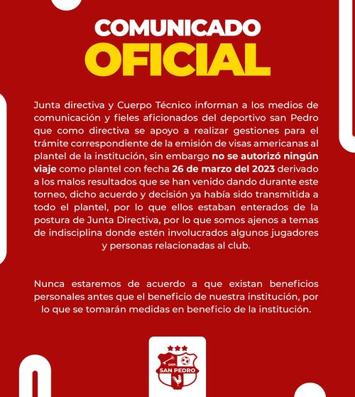 Además el equipo san pedrano indicó en un comunicado que son "ajenos a temas de indisciplina donde estén involucrados algunos jugadores y personas relacionadas al club", al igual mencionaron que no están de acuerdo a que existan beneficios personales de la institución por lo que tomarán acciones.