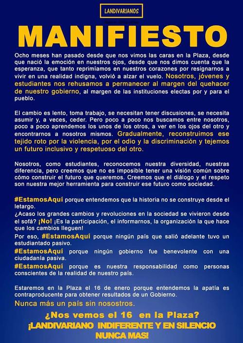 Varios colectivos ciudadanos convocan a los guatemaltecos a participar en una manifestación el próximo 16 de Enero a las 15:00 horas en las plazas del país y en el extranjero, con el objetivo de demandar estrategias, reformas y políticas públicas que atiendas los problemas graves del país.